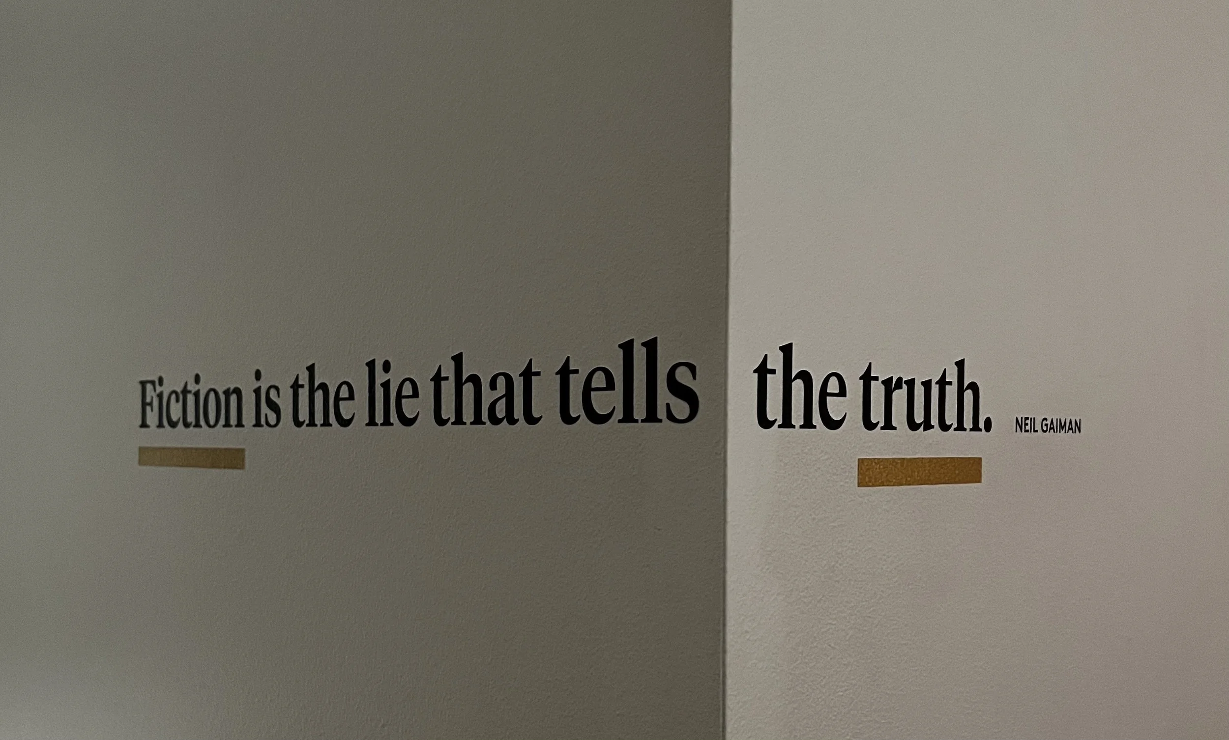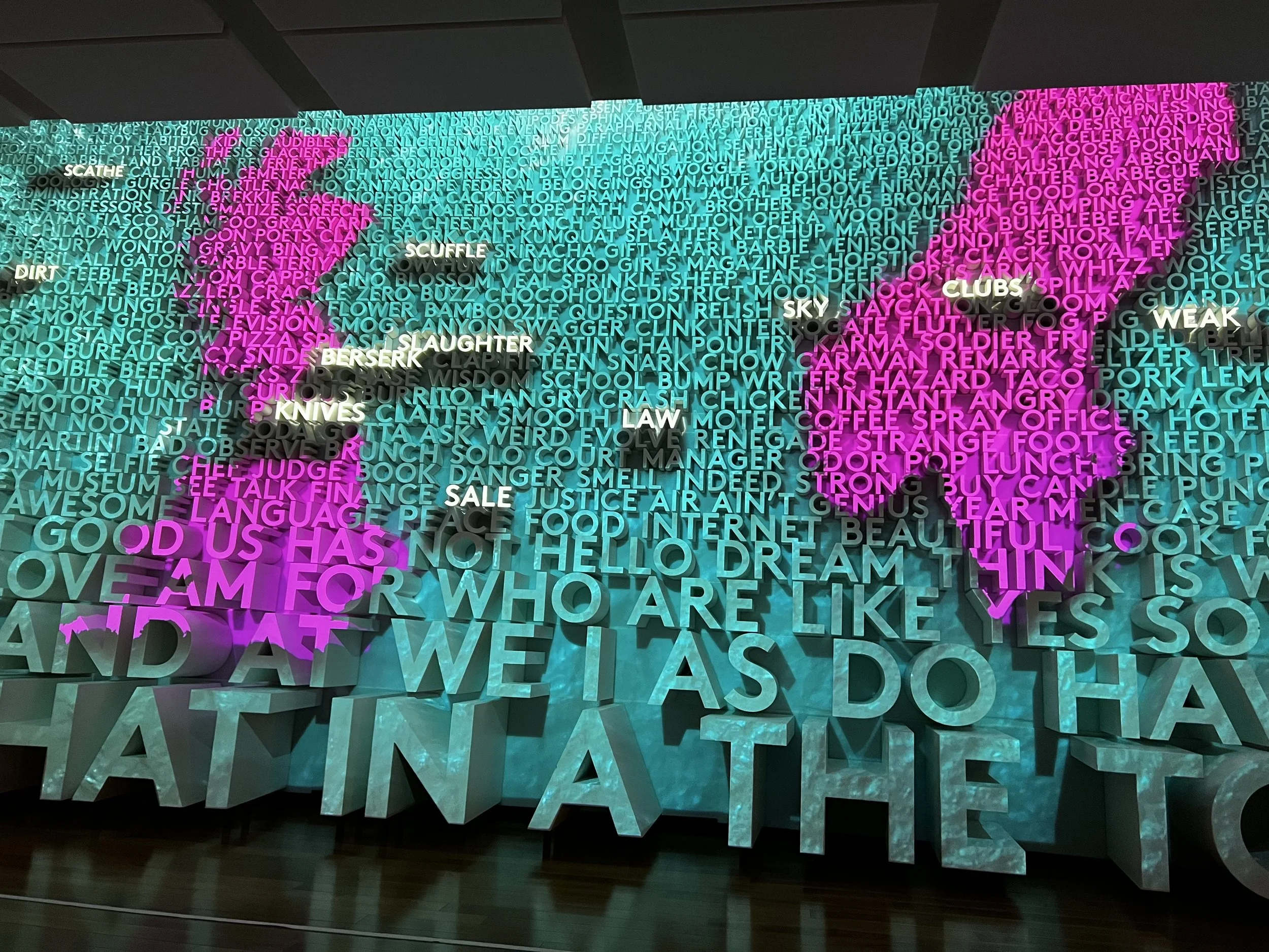The next room featured a massive wall covered in sculpted words. Every fifteen minutes, a presentation would begin, tracing the evolution of English and how it absorbed elements from French, German, Latin, and beyond. As the story unfolded, light and shadow transformed the wall— words glowing, maps appearing, languages converging. At certain points, the narration asked the audience questions, and the room’s microphones picked up our answers, integrating them into the show. It was interactive in the best possible way: not gimmicky, just alive.